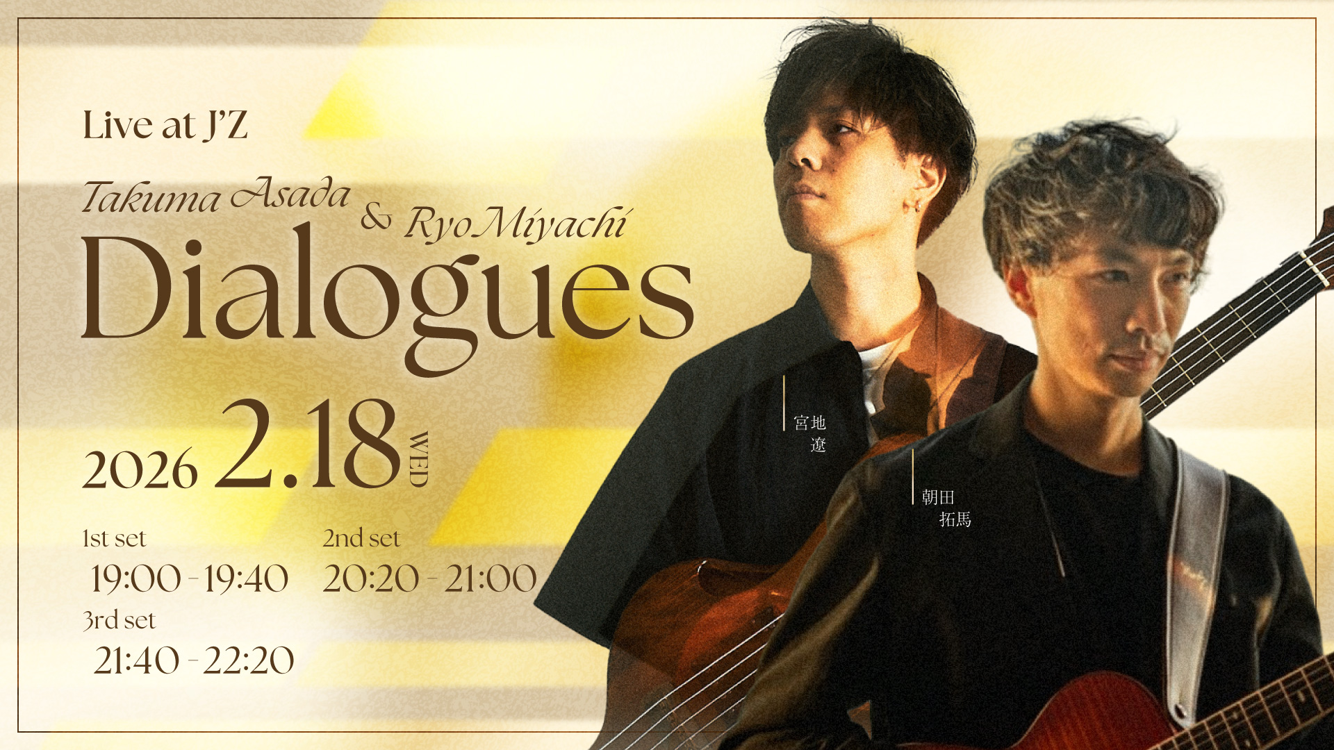 国内外で高く評価されるギタリスト朝田拓馬と、世界を舞台に活躍するベーシスト宮地遼によるデュオライブ。