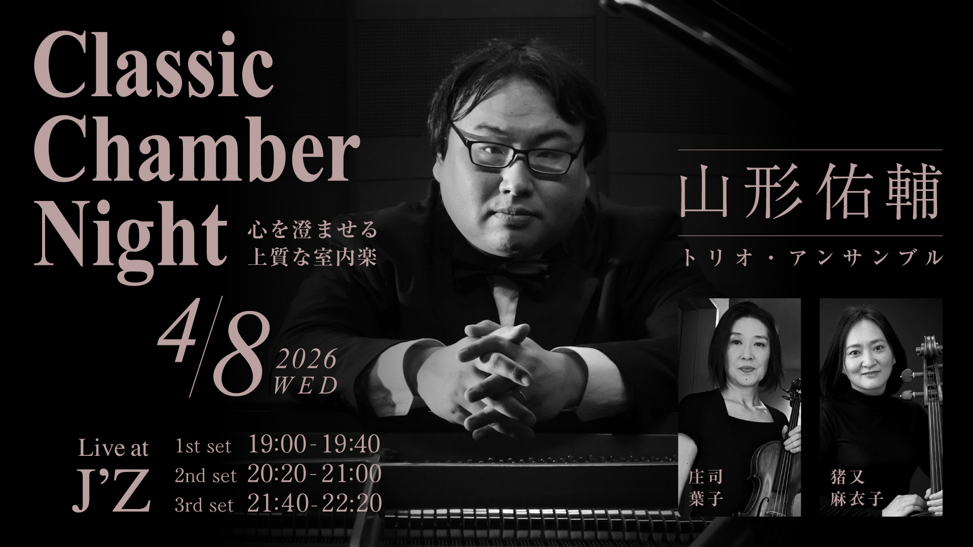 共演は、ヴァイオリニスト庄司葉子、チェリスト猪又麻衣子。三者が紡ぐ音は、時に優しく、時に情熱的に重なり合い、J’Zを豊かな響きで満たすことだろう。クラシックの名曲を中心にお届けする、気品と親密さをあわせ持つ特別な夜。
