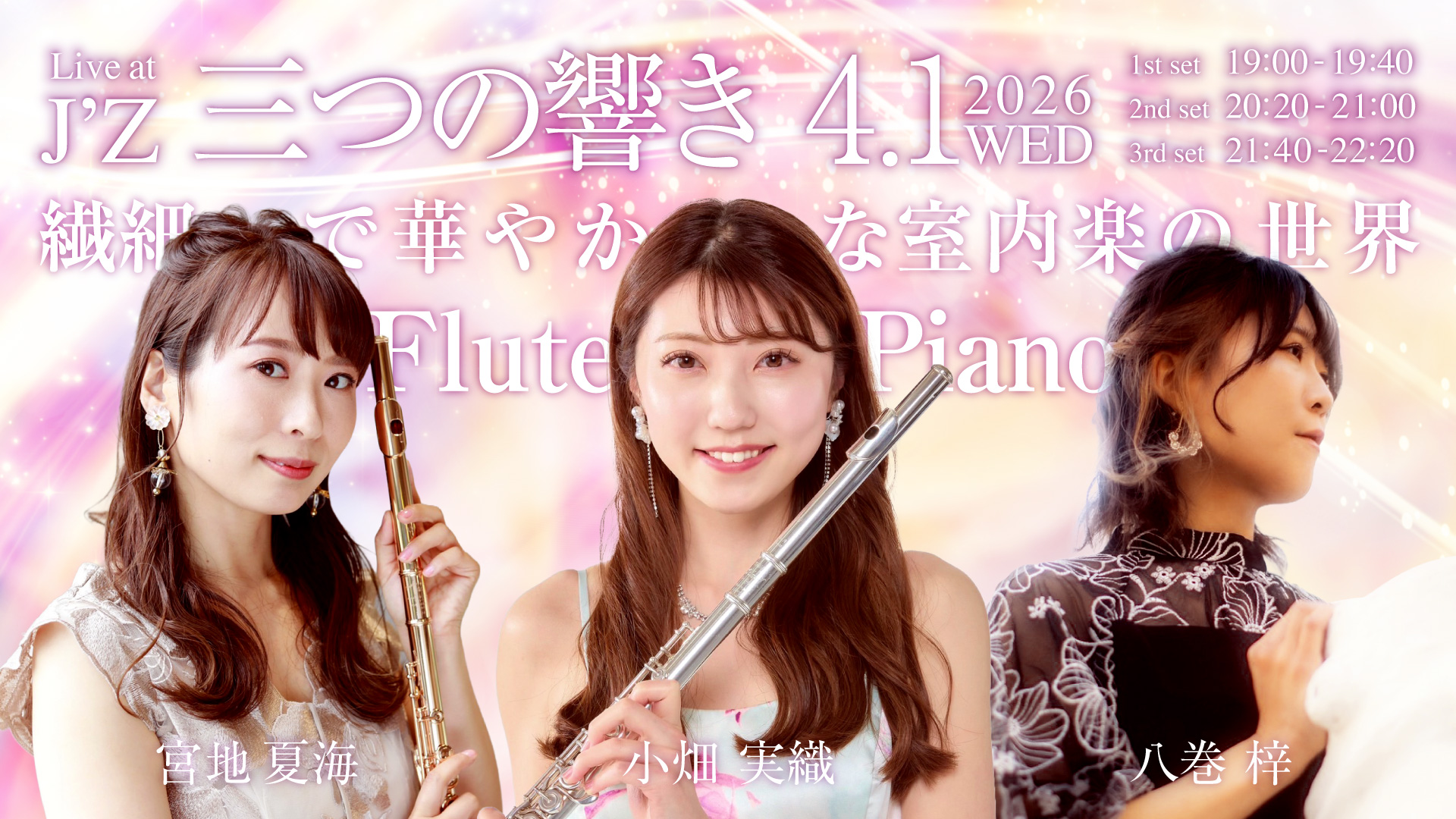 今夜のために集まった三人の音楽家、宮地夏海、小畑実織、八巻梓が、クラシックを中心に多彩な楽曲を取り上げ、バリエーション豊かなセットリストでステージを彩る。