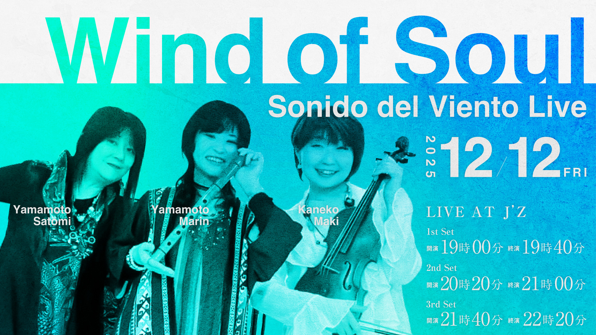 2006年に結成され、東北から全国へ魂の響きを届けてきた Sonido del Viento(ソニド・デル・ビエント南米やアイルランドの笛を操り、歌声で観客を圧倒するリード奏者・山本まりん。緻密なアレンジとダイナミックな鍵盤で音世界を創り出すリーダー・山本さとみ。さらに多彩なジャンルで輝きを放つヴァイオリニスト・金子まきを迎え、民族音楽とポップスを融合させた“みちのくSOUL MUSIC”を展開! 和と洋、伝統と革新が交差する圧倒的なステージ。心を揺さぶる風の音が、JʼZの夜を鮮烈に吹抜ける。