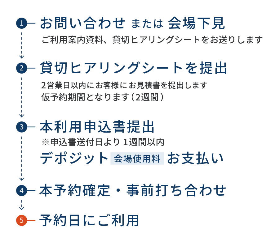 お問い合わせ または 下見完了後、当店より「ご利用案内資料」、利用詳細を伺わせていただく「貸切ヒアリングシート」をお送りします。ご記入のうえ、ご提出ください。